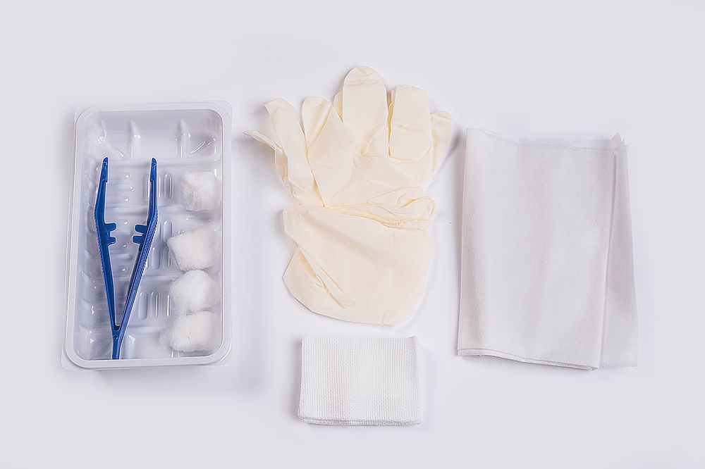 本品 A 型由標(biāo)準(zhǔn)配置一次性使用鑷子和選用配置一次性使用包布,醫(yī)用棉簽、醫(yī)用棉球、脫脂紗布?jí)K、一次性使用治療巾、檢查手套、一次性使用聚乙烯檢查手套、碘伏棉球、酒精棉球、一次性使用手術(shù)刀片、酒精棉簽、酒精面片、透氣創(chuàng)口貼、一次性使用無菌橡膠外科手套、醫(yī)用薄膜手術(shù)巾、一次性醫(yī)用中單、碘伏棉簽組成;B 型由標(biāo)準(zhǔn)配置托盤、非吸收性外科縫線和選用配置無菌應(yīng)用縫合針,一次性醫(yī)用孔巾、一次性使用包布,醫(yī)用棉簽、醫(yī)用棉球、脫脂紗布?jí)K、一次性使用治療巾、檢查手套、一次性使用聚乙烯檢查手套、碘伏棉球、酒精棉球、剪刀,一次性使用鑷子、無菌塑柄手術(shù)刀、次性使用手術(shù)刀片、酒精棉簽、酒精面片、透氣創(chuàng)口貼、一次性使用無菌橡膠外科手套、醫(yī)用薄膜手術(shù)巾、一次性醫(yī)用中單、碘伏棉簽組成
